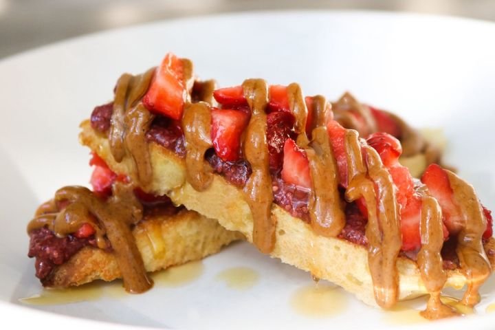 Gluten-free oats with house-made almond milk, maple syrup, and vanilla, accompanied by your choice of two toppings
